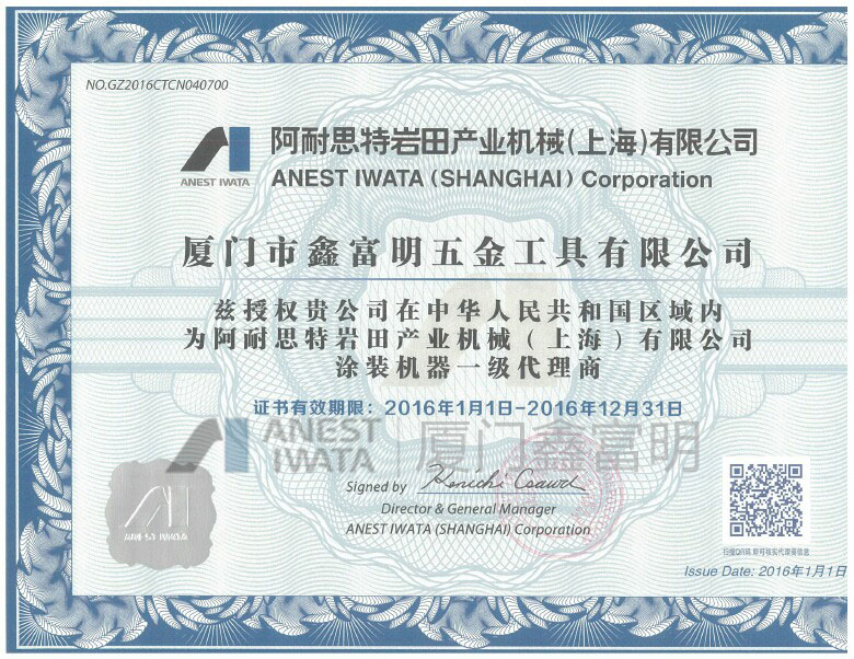以下是2016年度授權(quán)證書,請(qǐng)廣大的客戶朋友們,在購(gòu)買日本巖田噴槍時(shí),一定要求供應(yīng)商提供最新的代理證書并且查驗(yàn)證書編號(hào),以防上當(dāng)!